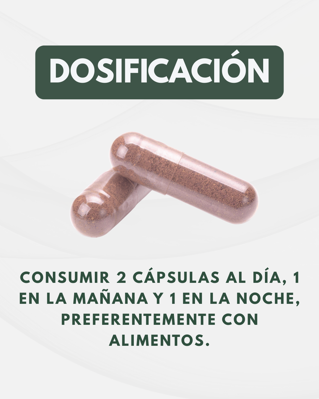 La porción recomendada es de 2 cápsulas al día, que entregan 900 mg de extracto estandarizado, una dosis adecuada para el uso diario.