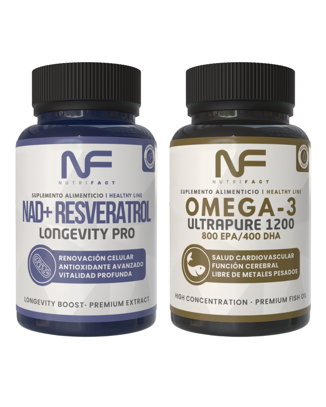 Este pack combina NAD+ Resveratrol Longevity Pro y Omega-3 UltraPure 1200, una dupla diseñada para apoyar la salud celular, la función metabólica y la protección del organismo frente al envejecimiento prematuro.